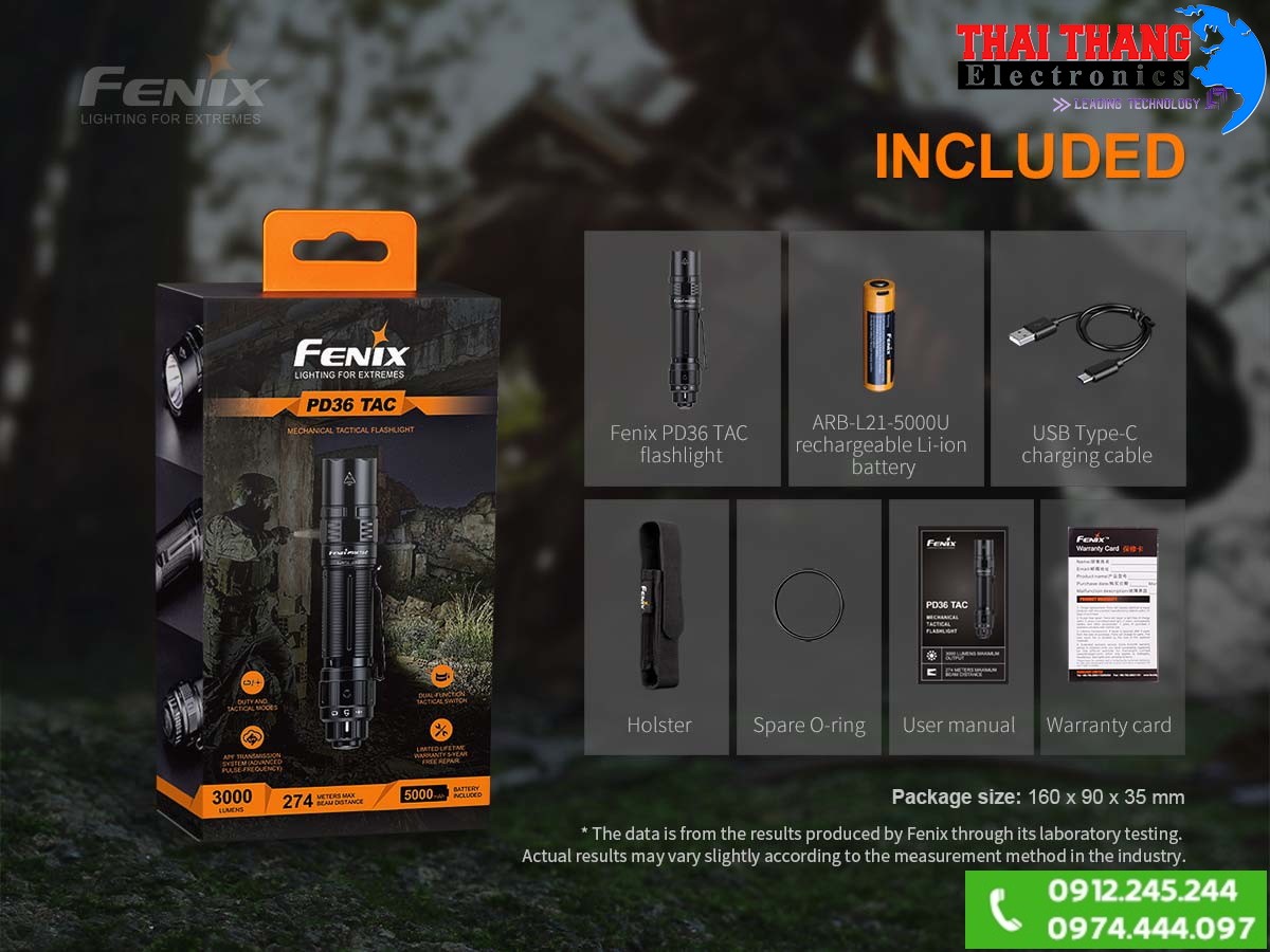 Đèn pin Fenix PD36 TAC là phiên bản nâng cấp của mẫu PD36R, đây là 1 trong những phiên bản bán chạy nhất của hàng Fxenix . Công tắc bật tắt xoay trên đuôi của PD36TAC cho phép bạn nhanh chóng chuyển đổi giữa chế độ an ninh vào chế độ thường. Đèn được trang bị nguồn điện được cung cấp bởi pin 21700, với cường độ án sáng tối đa 3000 lumen và khoảng cách chiếu xa lên đến 274m trong đêm. Đèn đạt chuẩn chống nước IP68 giúp đèn hoạt động tốt trong môi trường bụi bẩn, mưa gió hoặc chịu áp lực nước ở độ sâu 2m.