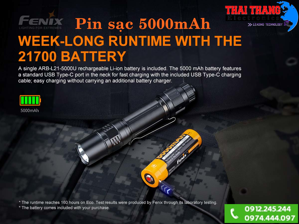 Đèn pin siêu sáng Fenix PD36 TAC cũng sử dụng chất liệu hợp kim nhôm siêu nhẹ 6061-T6, với chất liệu này cũng giúp cho đèn có độ bền cao, chịu được các tác động va đập, rơi rớt hoặc oxy hóa. Pin trang bị cho đèn là Li-ion 21700 có thể sạc lại khi hết, pin được tích hợp cổng sạc Type-C giúp thời gian sạc diễn ra nhanh hơn.