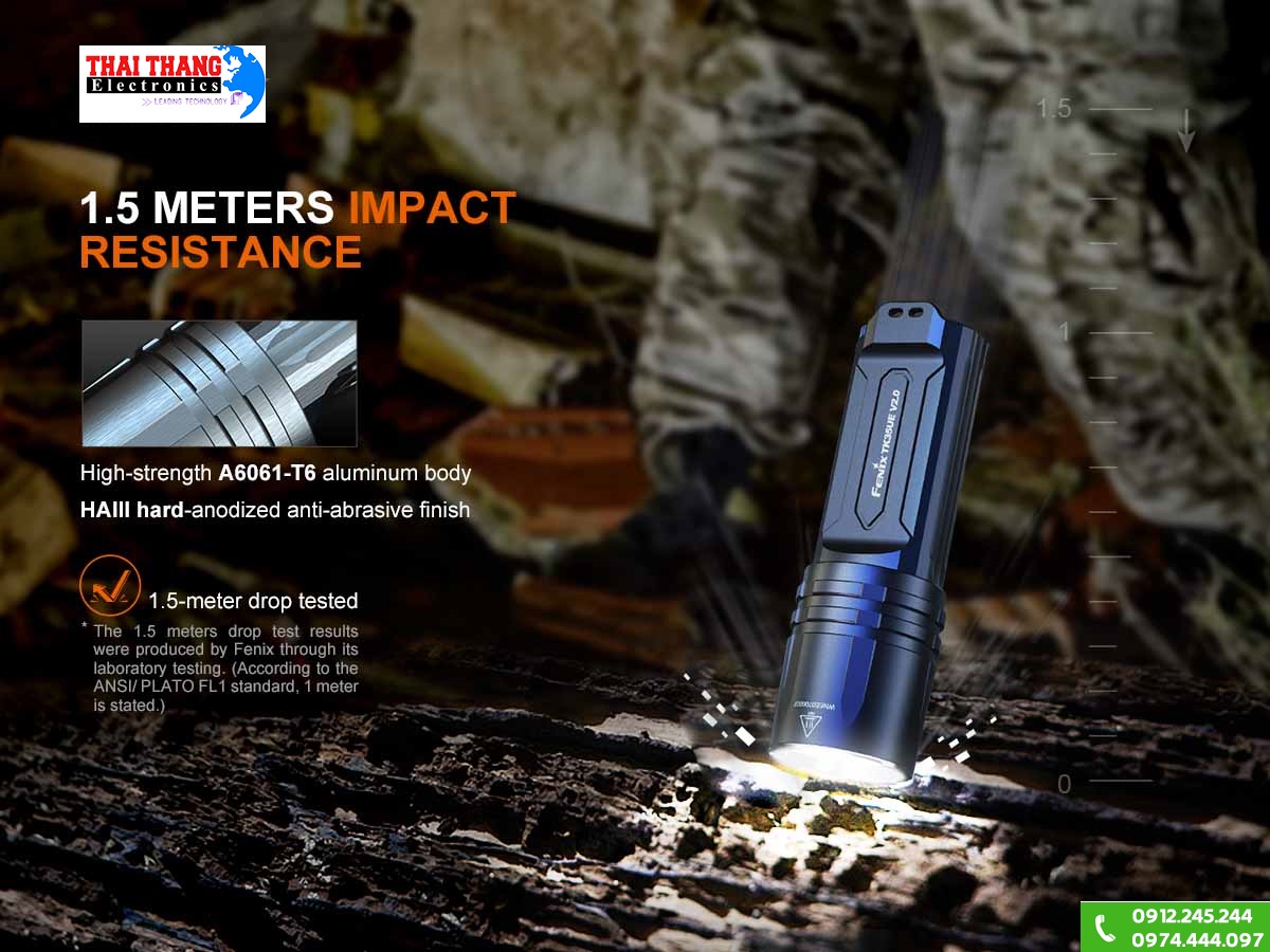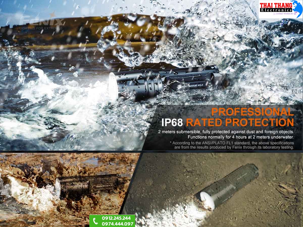 Đèn pin Fenix TK35UE V2.0 được cấu tạo bằng hợp kim nhôm A6061-T6 siêu bền và được hoàn thiện bằng lớp chống mài mòn cứng-anodized HAIII loại cao cấp khiến cho đèn vừa nhỏ gọn và nhẹ nhưng cũng cực kì chắc chắn , đèn có thể chịu đc va đập khi rơi từ độ cao 1.5m , đồng thời với khả năng chống nước IP68 đèn cũng có thể sử dụng thoải mái trong điều kiện thời tiết mưa bão khắc nghiệt