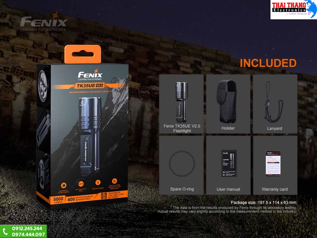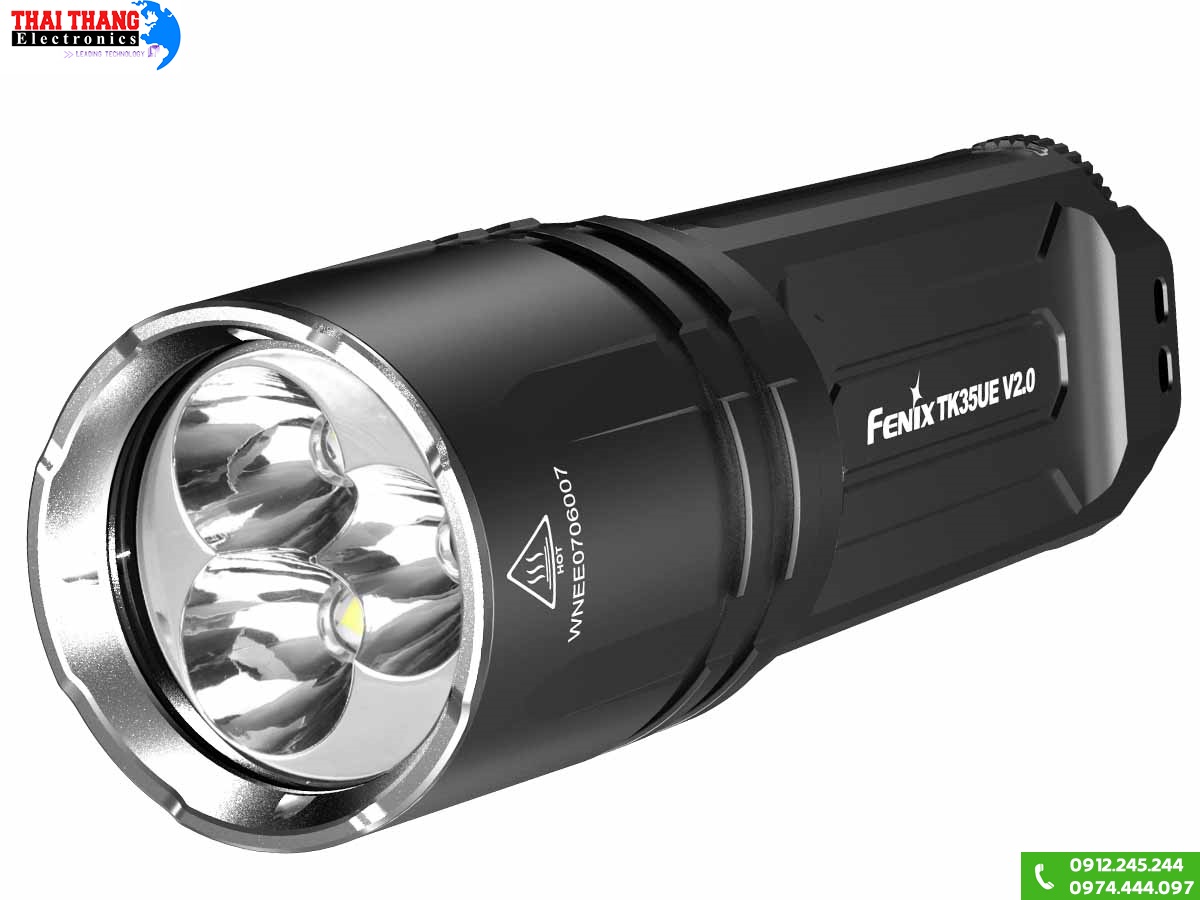 Đèn pin Fenix TK35UE V2.0 là phiên bản mới được nâng cấp của dòng đèn cầm tay TK35UE , phiển bản V2.0 này sử dụng nguồn sáng là 3 LED Luminus SST40 với tuổi thọ 50.000 giờ và công suất tối đa lên tới 5000 lumen. Phiên bản mới ngoài việc nâng cao độ sáng , đèn còn được thiết kế công tắc chuyển đổi thông minh, thuận tiện, cho phép người sử dụng nhanh chóng chuyển đổi giữa các chế độ chiếu sáng và chức năng khóa. TK35UE V2.0 có thể chiếu xa lên tới 400m và sử dụng liên tục 85h (chế độ ECO) cùng với khả năng chống va đập , chống bụi , chống nước , sản phẩm phù hợp để sử dụng cho nhiều mục đích khác nhau như tuần tra , giám sát , dã ngoại...