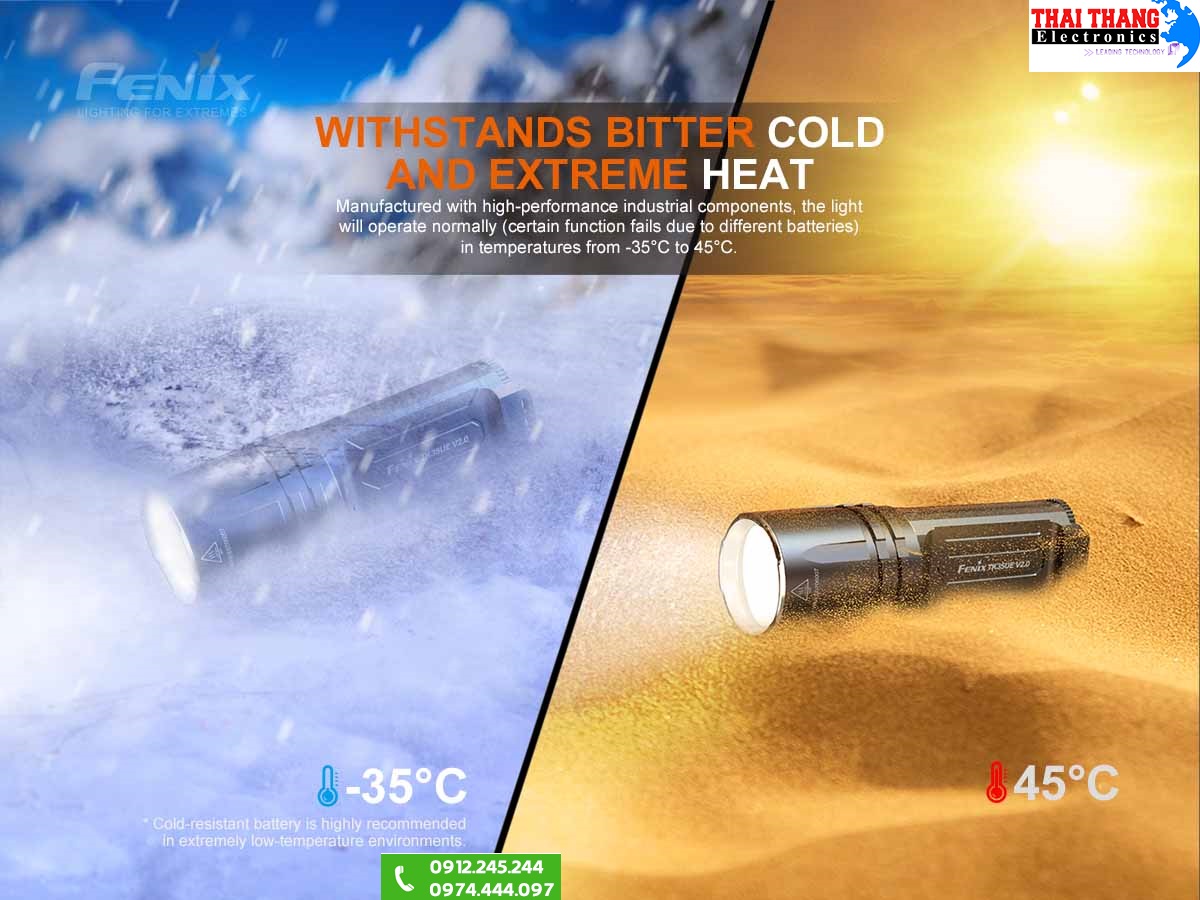 Fenix TK35UE V2.0 còn được tích hợp cảm biến cảnh báo quá nhiệt thông minh khi sử dụng lâu đèn sẽ tăng dần nhiệt độ, khi đạt đến nhiệt độ từ 60°C trở lên, đèn sẽ tự động giảm một vài lumen để giảm nhiệt độ. Khi nhiệt độ giảm xuống dưới 60°C, nó sẽ cho phép người dùng chọn lại các chế độ sử dụng