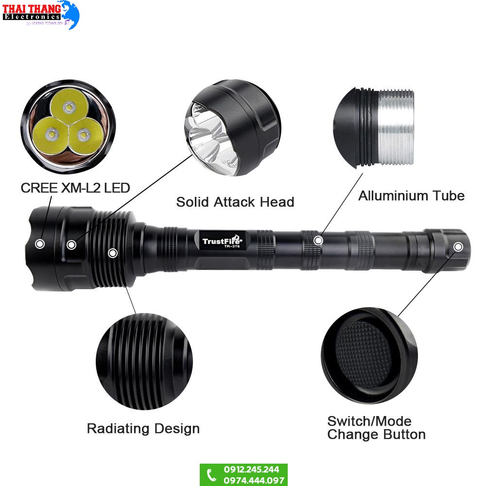 TrustFire TR-3T6 là mẫu Đèn pin LED siêu sáng với cường độ ánh sáng lên tới 3800 Lumens , cùng với 5 chế độ chiếu sáng có thể thay đổi thuận tiện , đây là mẫu đèn pin phù hợp với nhiều công việc khác nhau như , tuần tra , bảo vệ , du lịch , dã ngoại ...