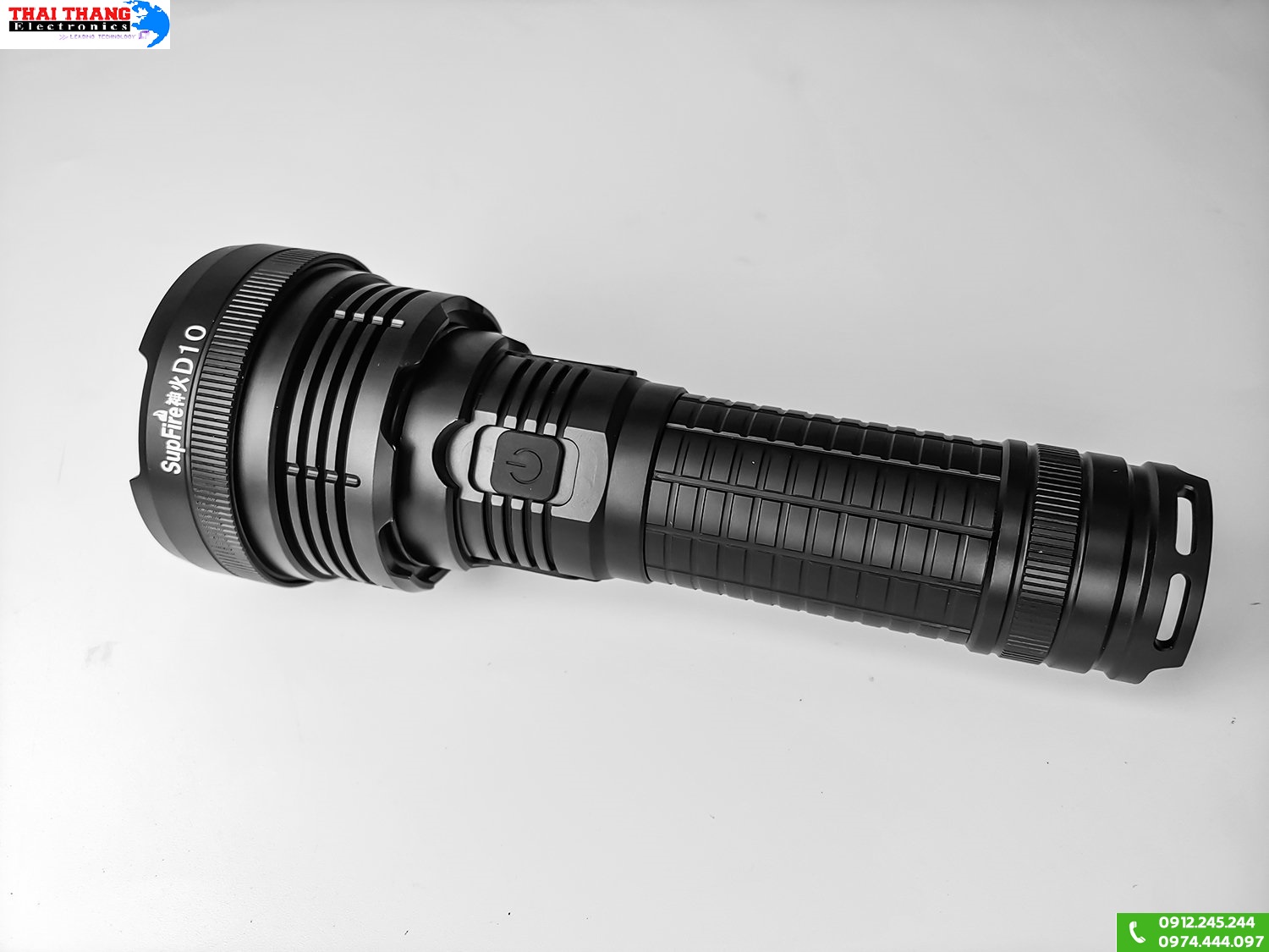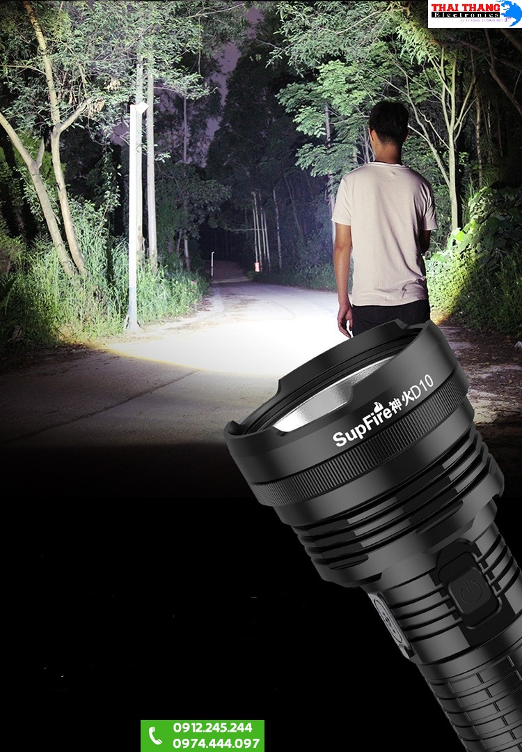 Đèn pin Supfire D10 2021 sử dụng bóng đèn Led Cree XML-2 cho ánh sáng vượt trội lên đến 1400 lumens. Đèn có ánh sáng trắng với khả năng chiếu xa lên tới 300m trong đêm tối. Supfire D10 sử dụng nguồn là pin lithium 3700mAh có thể chiếu sáng liên tục từ 3-5h ( tùy vào chế độ chiếu sáng ). Đèn có thể sạc trực tiếp trên thân đèn thông qua cổng sạc USB giúp bạn có thể tận dụng tối đa nguồn sạc như máy tính, sạc dự phòng , ngoài ra với thiết kế mới này , đèn còn có thể thay thế 1 chiếc sạc dự phòng khi có thể sạc pin cho các thiết bị khác như smart phone , máy tính bảng ...