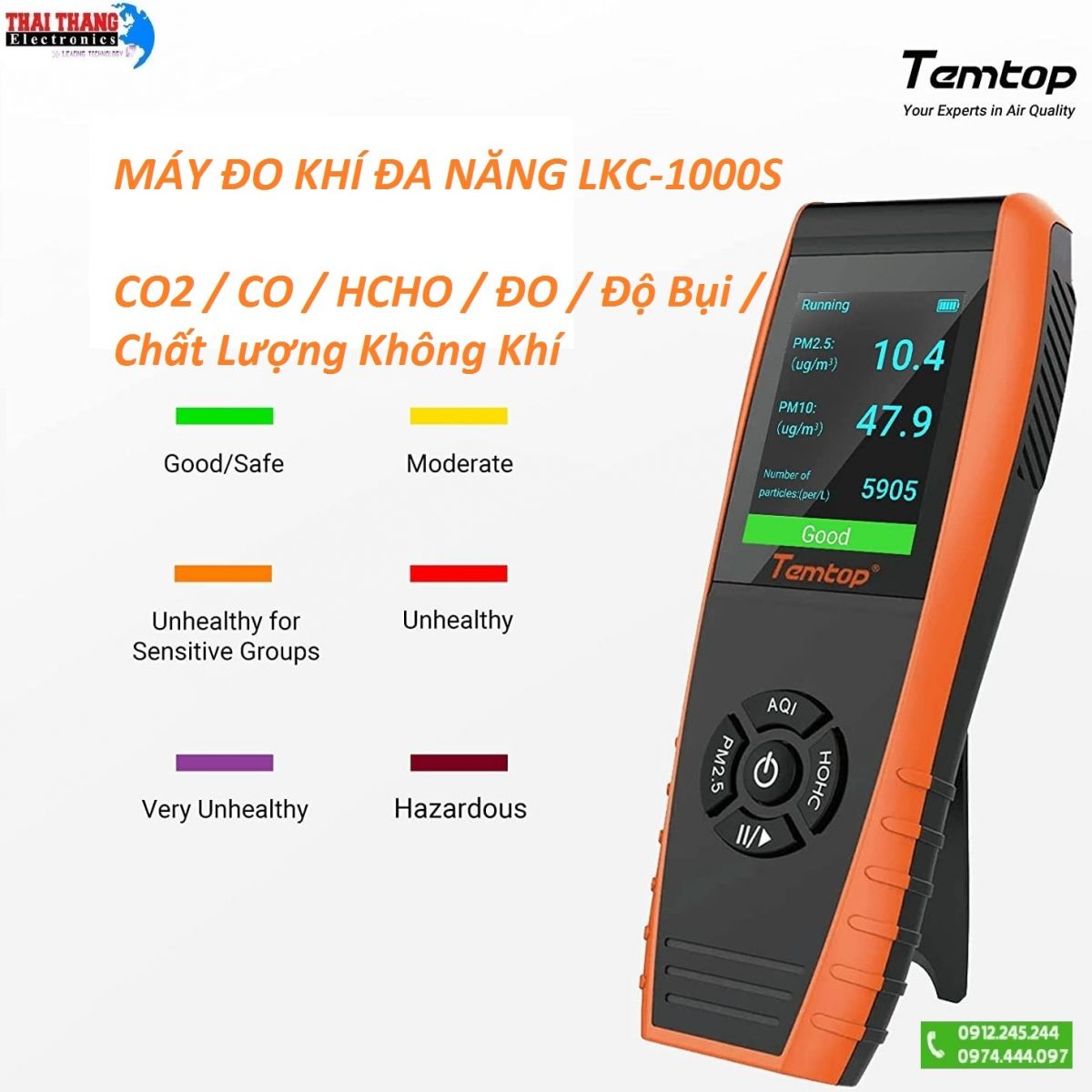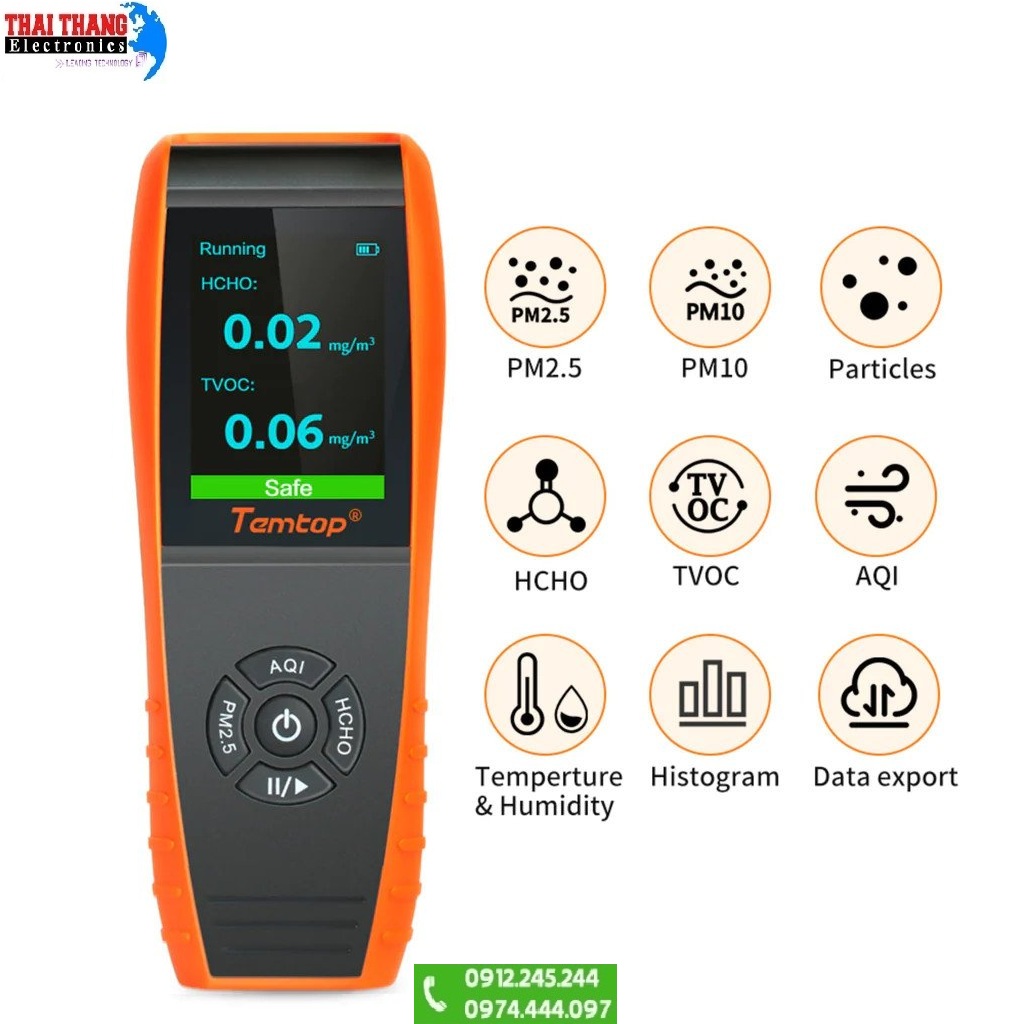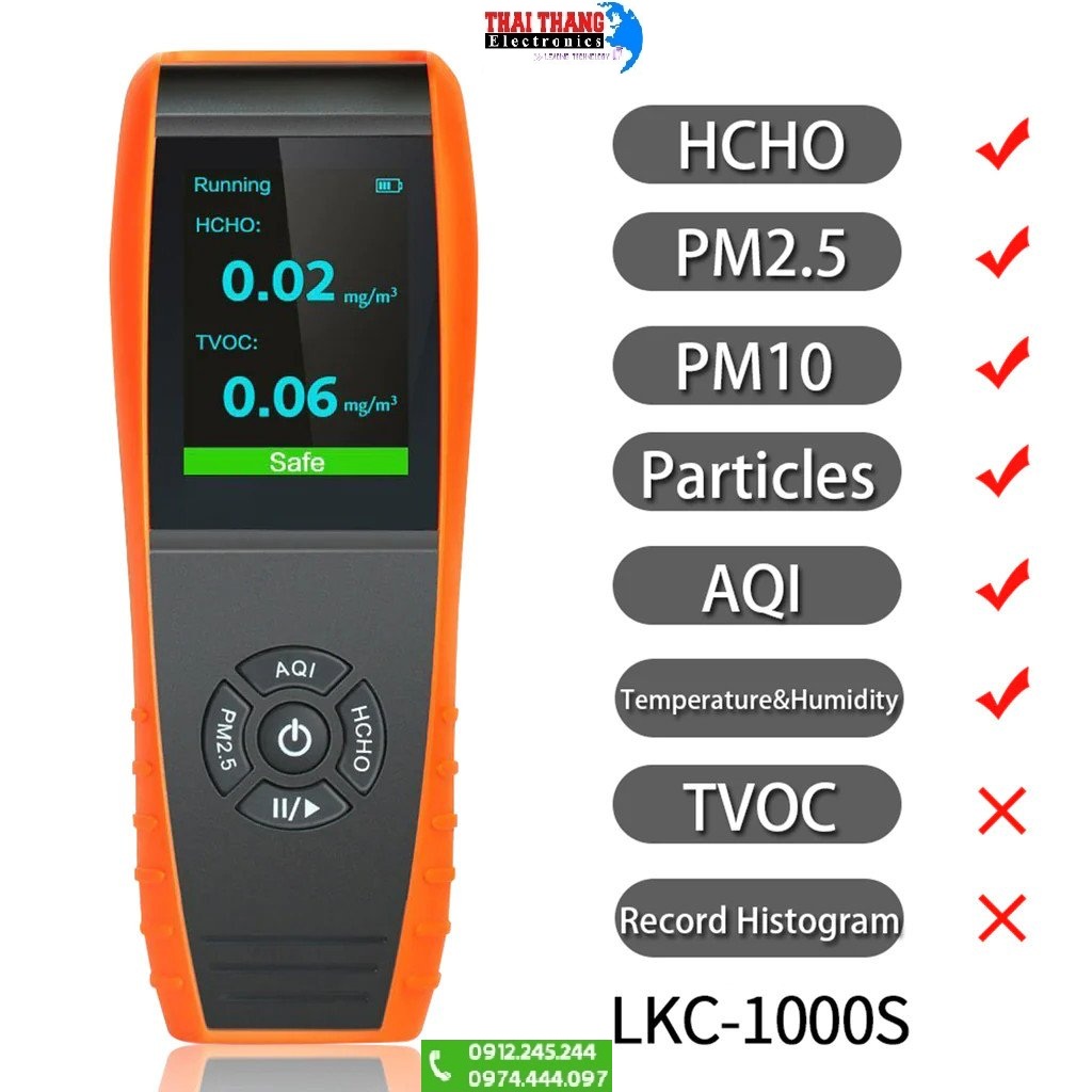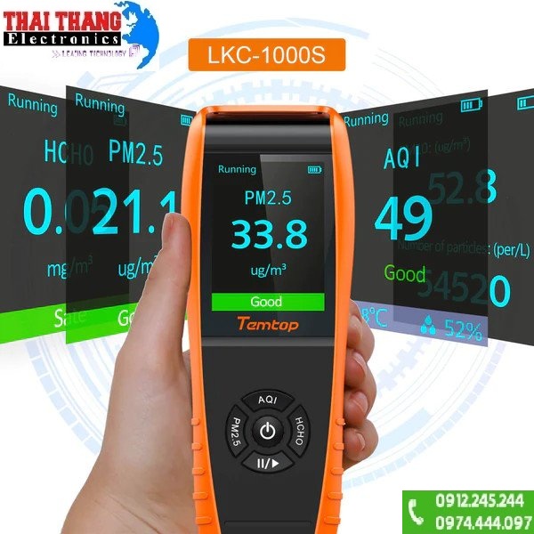 Máy đo khí đa chỉ tiêu chính hãng Temtop LKC-1000S sử dụng cảm biến hạt laser và cảm biến aldehyd dạng điện hóa xác định được các loại bụi thông thường, bụi mịn PM2.5 và PM10 với phạm vi đo từ 0-999µg/m³, các loại khí độc hại như HCHO (Formaldehyde) phạm vi đo 0-2mg/m³, hiển thị AQI (chỉ số chất lượng không khí), nhiệt độ, độ ẩm,…. Màn hình LCD màu kích thước lớn giúp người dùng dễ dàng quan sát trong nhiều môi trường khác nhau, 6 mức màu hiển thị giúp người dùng dễ dàng biết được tình trạng môi trường đang ở. Máy sở hữu thiết kế nhỏ gọn, người dùng có thể mang theo bên người và sử dụng bất cứ lúc nào và bất kỳ nơi đâu. Chất liệu nhựa ABS và nhựa PC giúp máy bảo vệ sản phẩm khỏi các tác động mạnh. Nguồn trang bị cho máy là pin sạc Li-ion dung lượng 3000mAh cho thời gian sử dụng từ 7 đến 8 giờ.