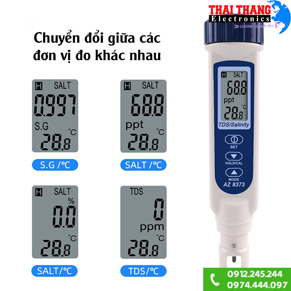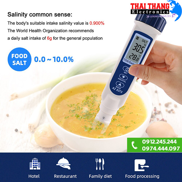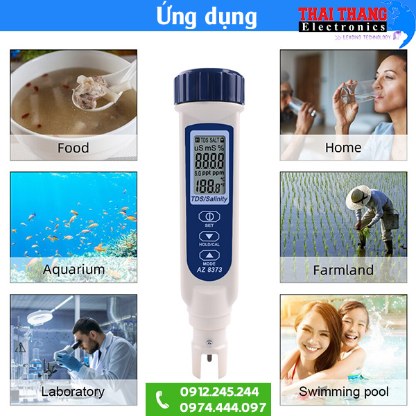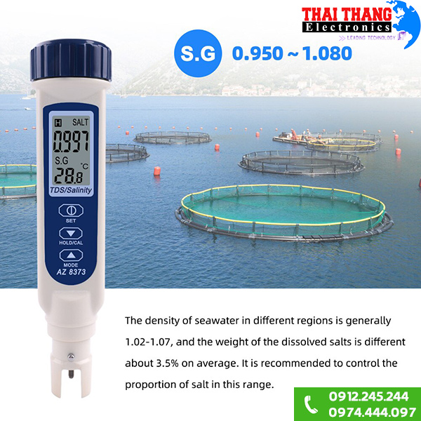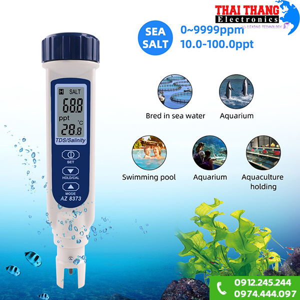 Bút đo độ mặn của nước AZ-8373 đạt tiêu chuẩn chống nước IP65 với vỏ ngoài bằng nhựa cao cấp, chịu được ăn mòn của nước biển. Sản phẩm được trang bị cho hộ gia đình Đồng Bằng Sông Cửu Long trước tình trạng nhiễm mặn gây ảnh hưởng đến sinh hoạt và sản xuất nông nghiệp.