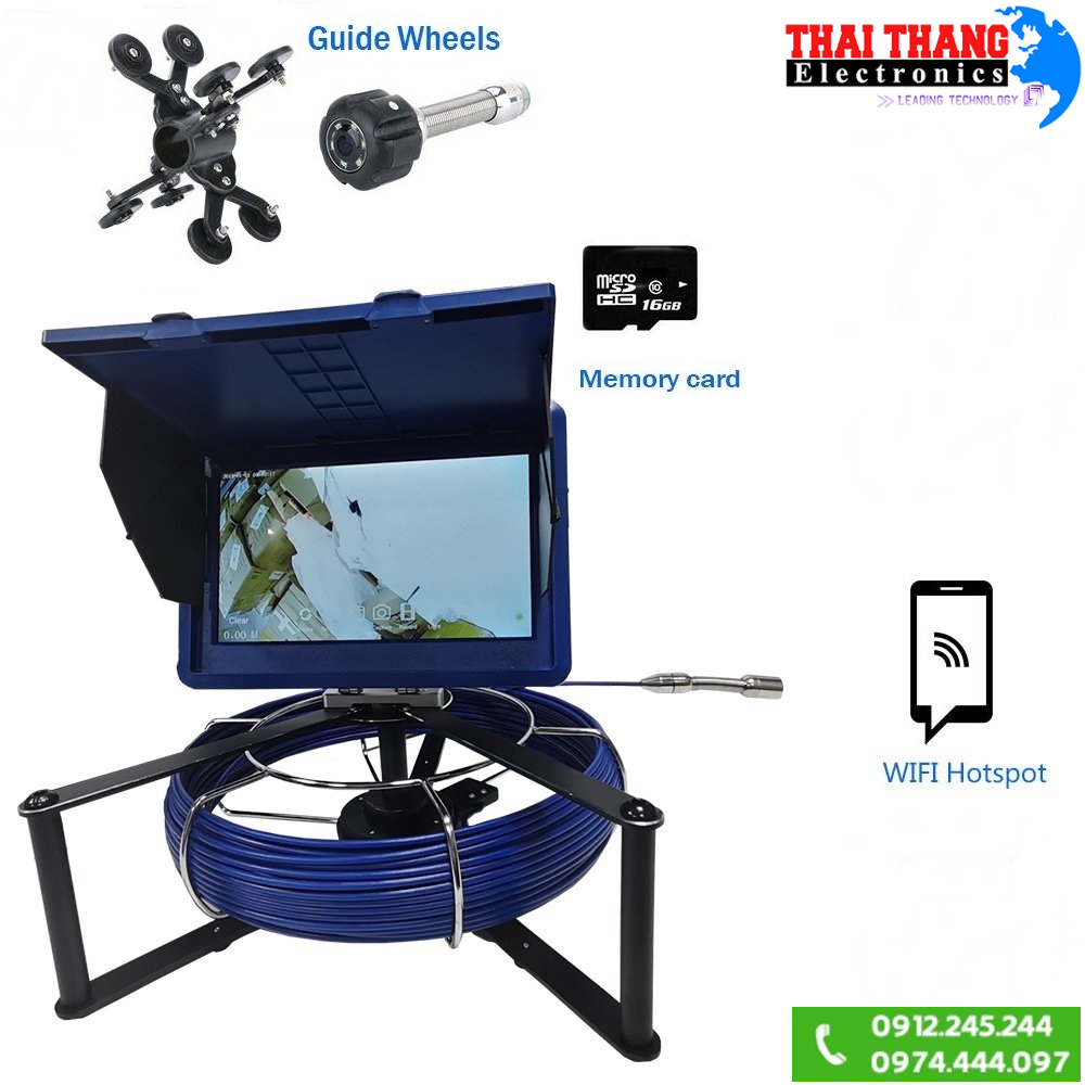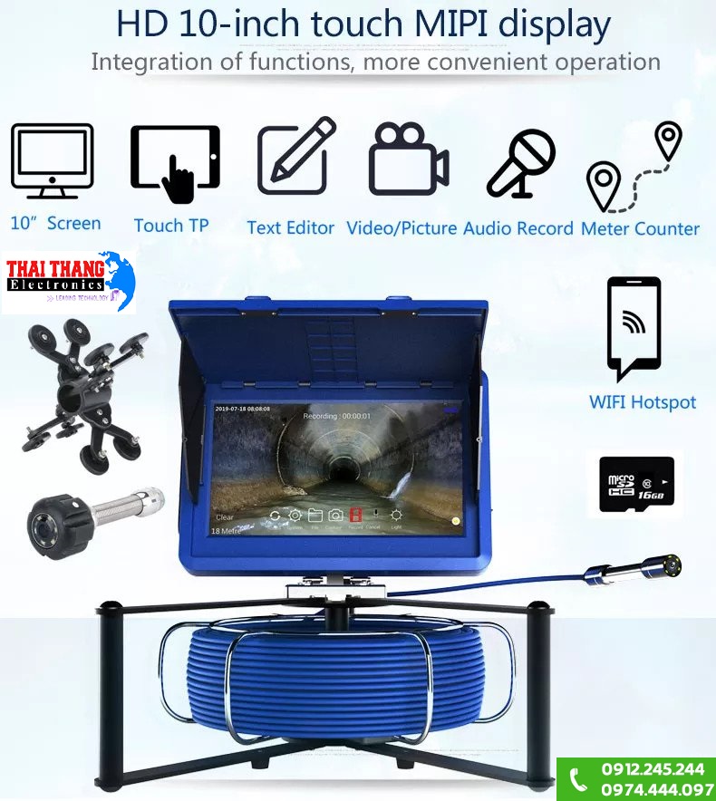 Hình ảnh quan sát sẽ hiển thị trên màn hình LCD màu kích thước 10inch có độ phân giải 1024*600, đặc biệt màn hình cảm ứng giúp người dùng dễ dàng thao tác vận hành sản phẩm. Ngoài quan sát trên màn hình, người dùng còn có thể quan sát trên các thiệt bị Smartphone thông qua kết nối không dây, điều này sẽ hỗ trợ cho 8 thiết bị xem cùng lúc với khoảng cánh lên đến 80m. Hàng loạt các tính năng quan trọng khác như ghi hình kèm ghi âm thanh, chụp ảnh, đếm chiều dài dây khi sử dụng, hỗ trợ 10 loại ngôn ngữ Anh, Pháp, Đức, Ý, Nhật, Trung,….