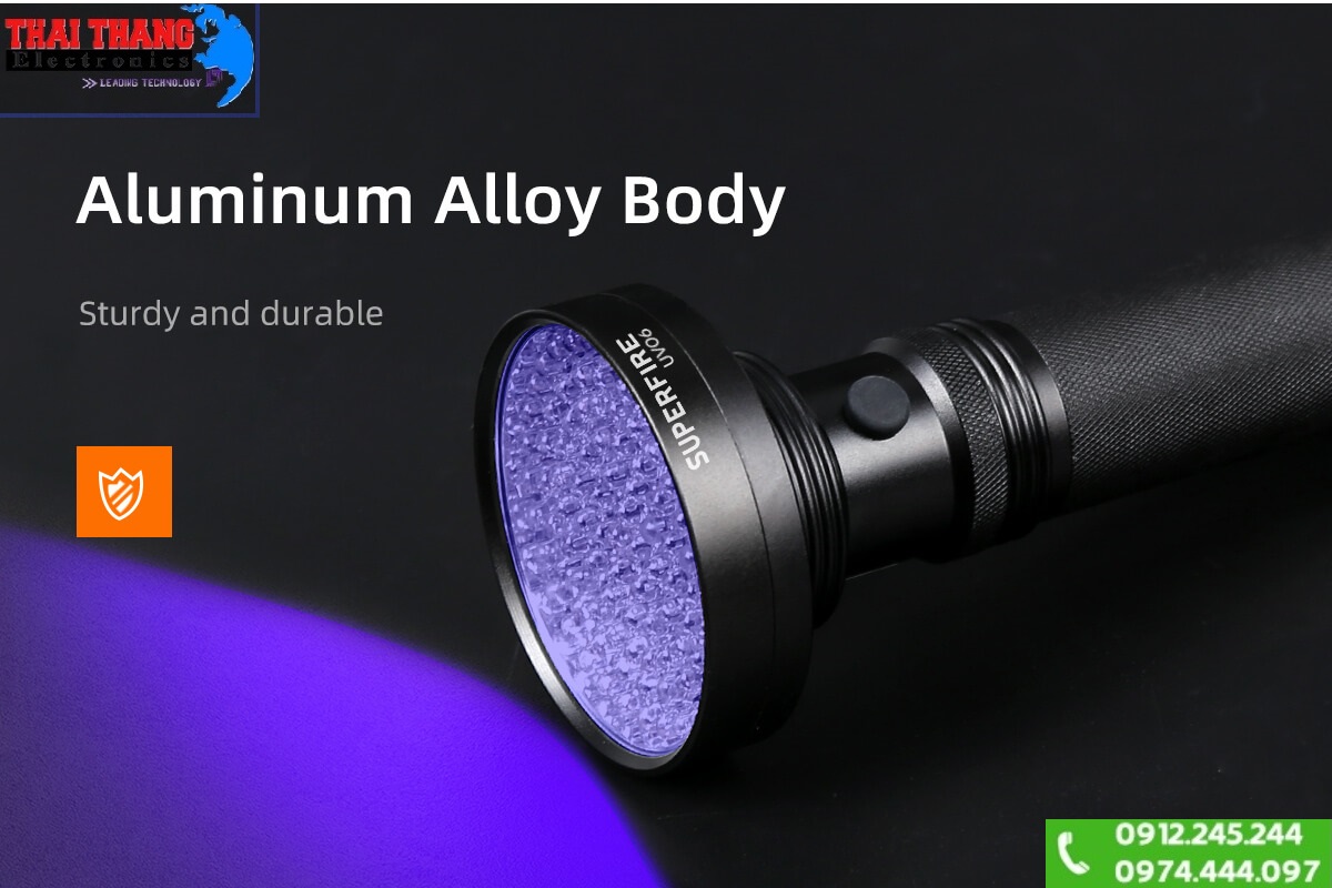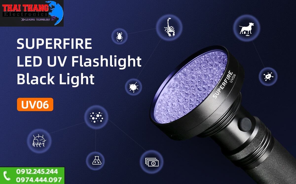 Đèn UV chuyên dụng Supfire UV06 được trang bị lên đến 100 bóng Led , cho công suất 6W và bước sóng đạt 395nm , phù cho các công việc kiểm tra hàng giả , làm khô keo công nghiệp , kiểm tra vết nứt ... Đèn dược trang bị đến 100 led nên ánh sáng phát ra có độ tỏa cao, chiếu sáng được diện tích rộng. Đèn sử dụng chất liệu hợp kim Aluminum khiến cho đèn có trọng lượng nhẹ nhưng vẫn có khả năng chịu được các tác động như va đập, rơi rớt. Thân đèn được tiện CNC các khe rãnh tản nhiệt giúp đèn có thể hoạt động trong thời gian dài mà không bị nóng.