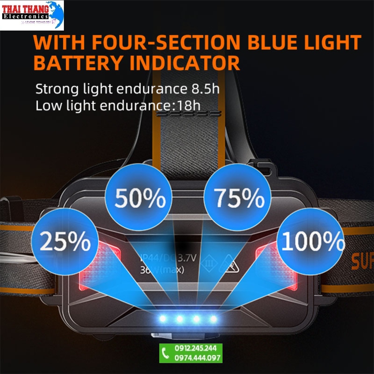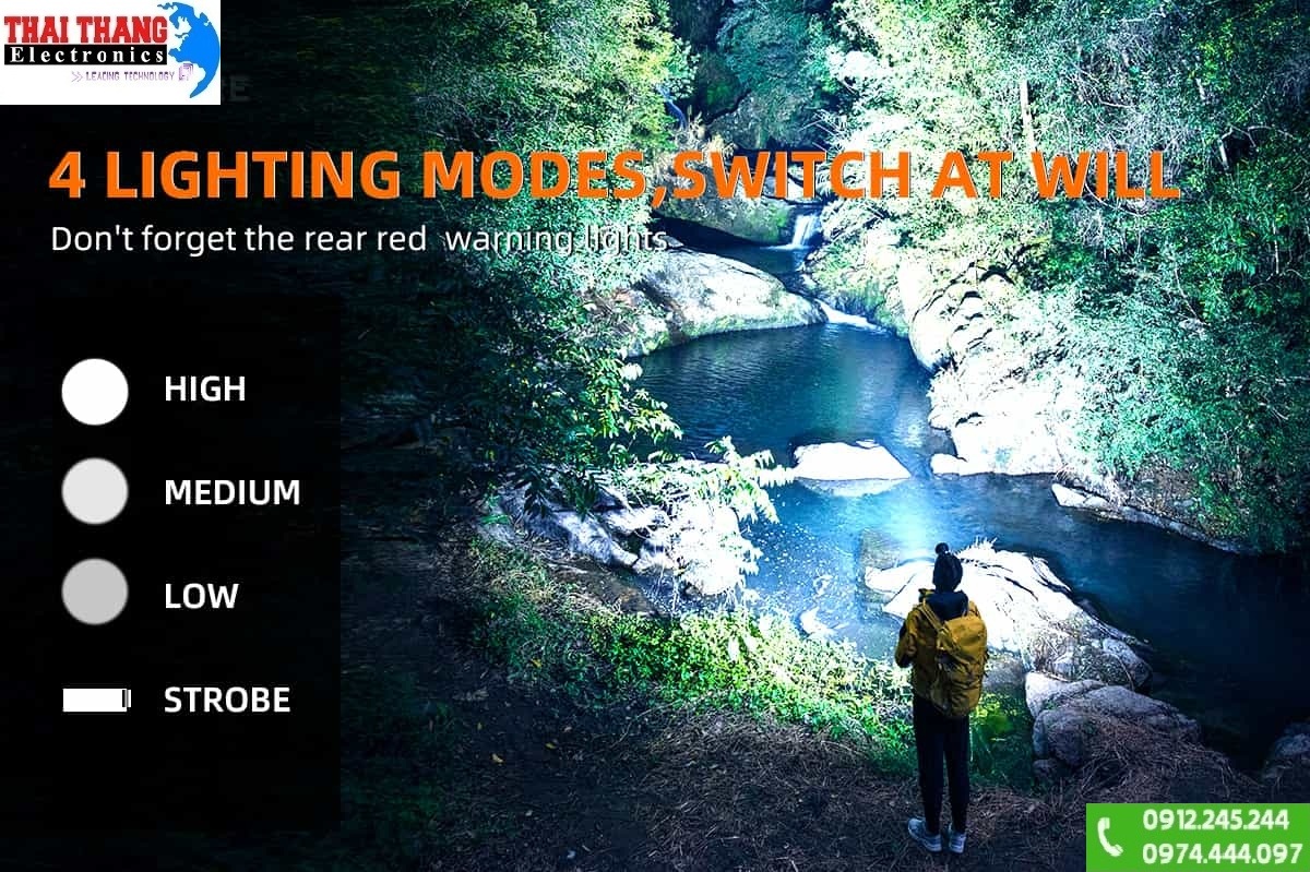 - Đèn có 4 chế độ chiếu sáng mạnh, vừa, yếu, nhấp nháy