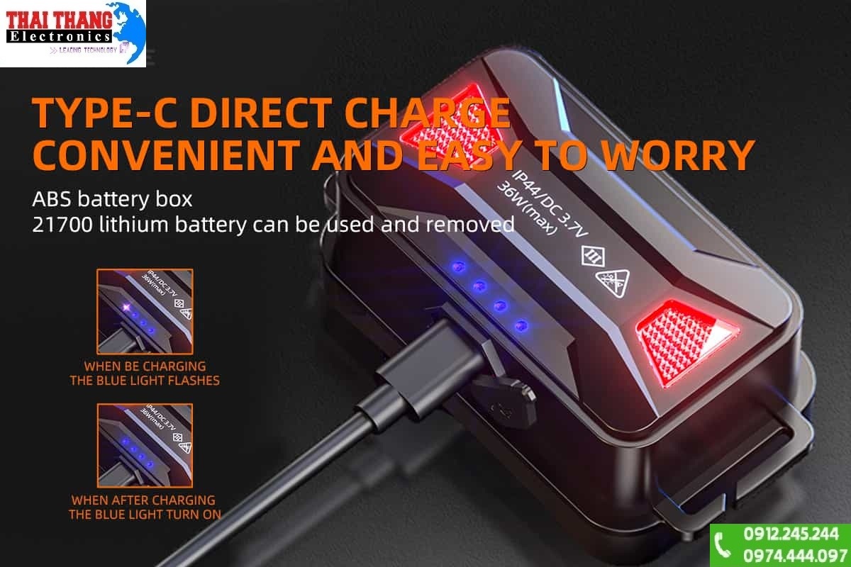 - Sử dụng nguồn là pin sạc 21700 dung lượng 4000mAh