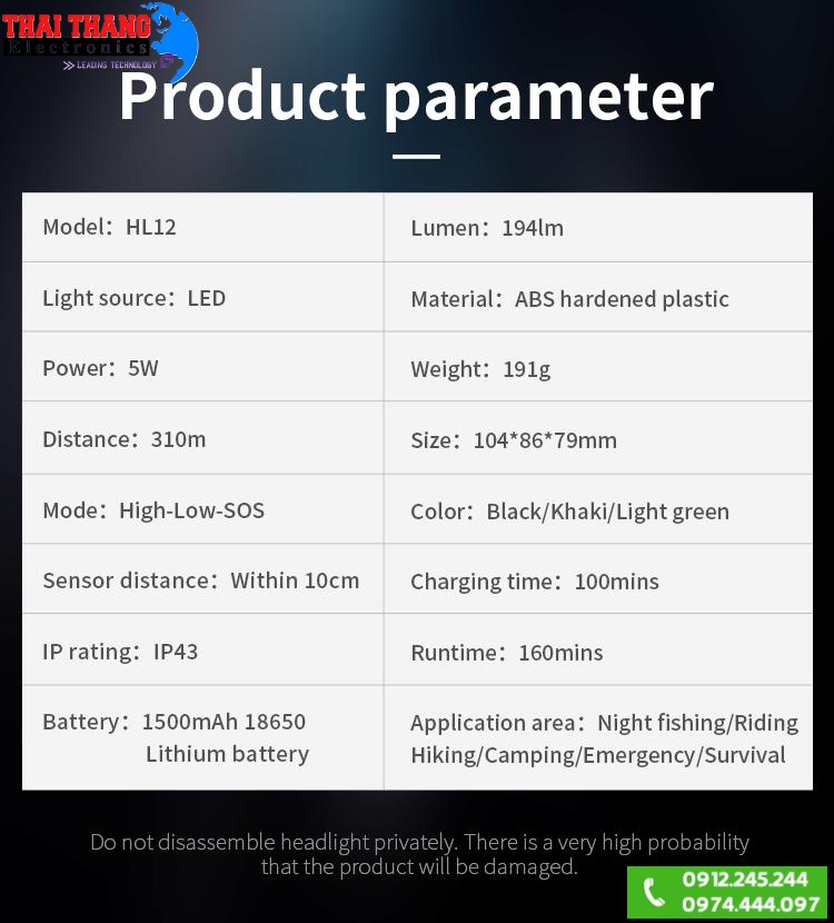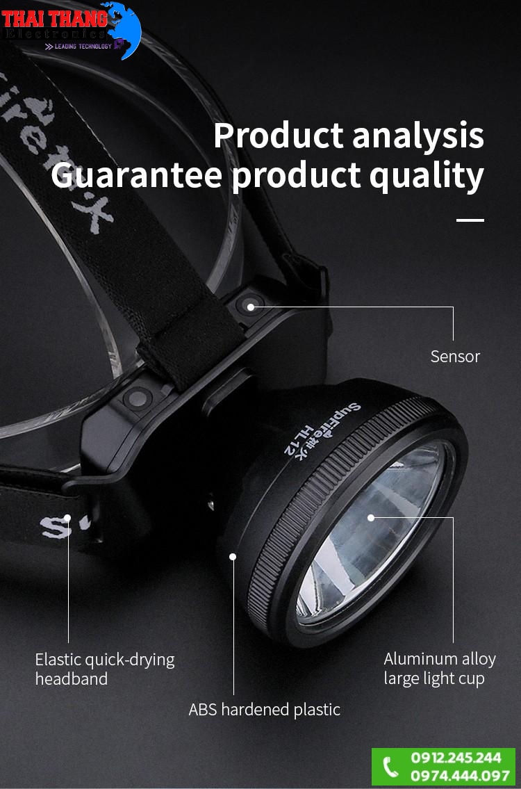 Đèn pin đeo đầu SupFire HL12 sử dụng bóng Led độ bền cao có công suất 5W với cường độ sáng lên đến 194 lumens. Chóa đèn rộng và sâu đồng thời được mạ nhôm sáng giúp đèn có khoảng cách chiếu xa đến 310m trong đêm. Đặc biệt đèn trang bị cảm biến bật tắt từ xa với khoảng cách 10cm vô cùng hiện đại cho phép người dùng bật hoặc tắt đèn một cách nhanh chóng mà không cần chạm vào đèn. Đèn có ba chế độ sáng là mạnh, vừa và SOS. Chất liệu của đèn làm bằng nhựa ABS độ bền cao trọng lượng nhẹ, dây thun đeo đầu có độ co giãn tốt, có thể điều chỉnh phù hợp với từng kích cỡ đầu. Góc mở của đèn rộng 90° giúp việc chiếu sáng thuận tiện, linh động hơn.