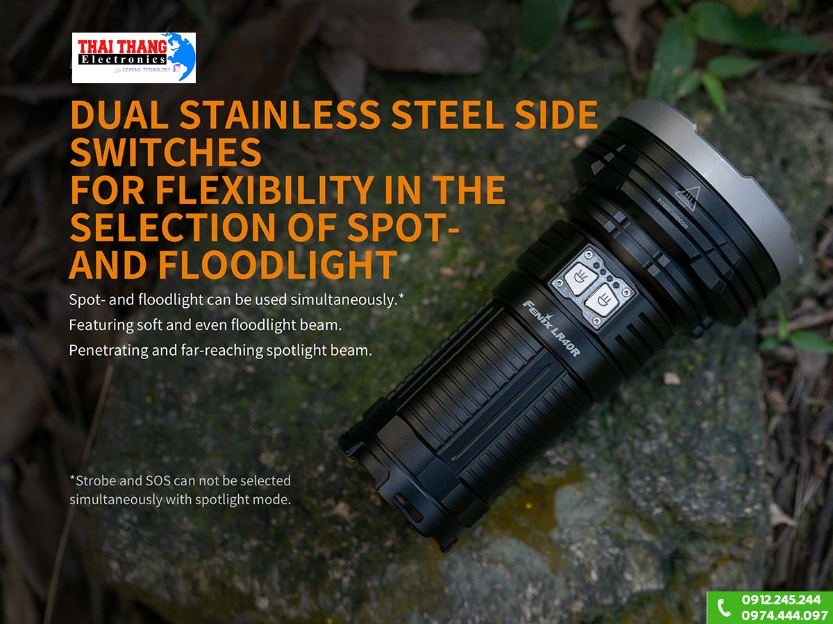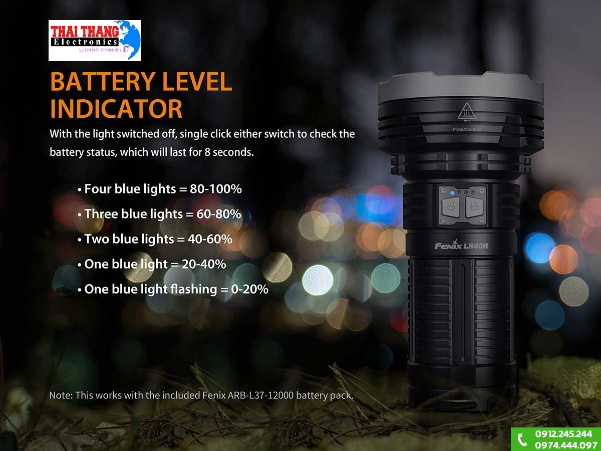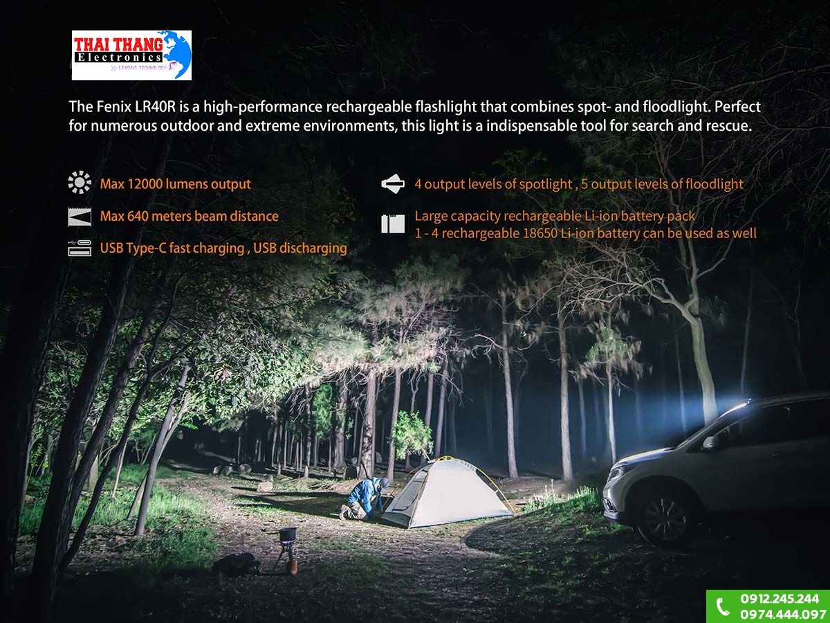 Fenix LR40R là dòng đèn pin sử dụng chip led Cree làm nguồn sáng chính cho cường độ sáng lên đến 12000lumens, ngoài led chính đèn còn tích hợp thêm 18 led phụ xung quanh, phù hợp cho nhiều hoạt động chiếu sáng khác nhau, đèn được tích hợp 2 chức năng chiếu sáng đó là đèn pha và đèn chiếu. Người sử dụng có thể tùy chọn sử dụng đèn chiếu xuyên thấu để chiếu xa với khoảng cách chiếu tối đa lên tới 640m hoặc đèn pha cực sáng để chiếu sáng tất cả môi trường xung quanh với khoảng cách 410m