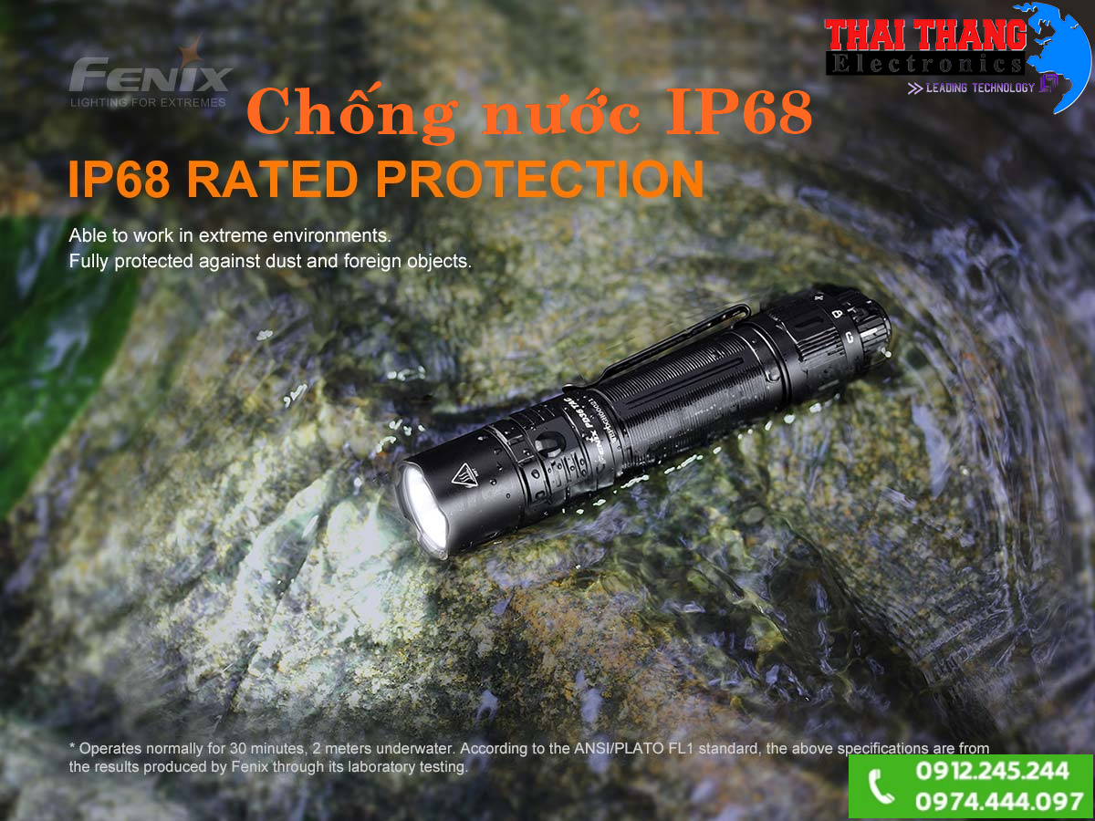 Đèn pin chính hãng Mỹ Fenix PD36 TAC tuy là dòng sản phẩm bỏ túi nhưng lại có độ sáng lên đến 3000 lumens nhờ vào chip led Luminus SST70 chính hãng Mỹ. Đèn được thiết kế với 8 chế độ sáng bao gồm 2 chế độ cho an ninh như sáng cao 2000 lumens, nhấp nháy 2000 lumens; 6 chế độ thông thường như sáng tiết kiệm 30 lumens, sáng thấp 150 lumens, sáng vừa 350 lumens, cao 1000 lumens, siêu sáng 3000 lumens và nhấp nháy 2000 lumens. Các chế độ sáng sẽ được chuyển đổi nhanh chóng giữa các chế độ an ninh và các chế độ thuông thường khi xoay đuôi đèn. Chóa đèn được tráng gương chuyên dụng giúp ánh sáng được truyền đi xa với khoảng cách lên đến 274m trong đêm. Đèn đạt chuẩn chống nước IP68 giúp đèn hoạt động tốt trong môi trường bụi bẩn, mưa gió hoặc chịu áp lực nước ở độ sâu 2m.