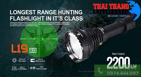 Đèn pin cầm tay chiến thuật siêu sáng Acebeam L19 2.0 được trang bị 7 chế độ chiếu sáng cho người dùng dễ dàng lựa chọn tùy vào từng nhu cầu sử dụng khác nhau : gồm Turbo siêu sáng 2200 lumens, sáng mạnh 1200 lumens, sáng trung bình (1) 630 lumens, sáng trung bình (2) 300 lumens, sáng yếu 100 lumens, tiết kiệm 1 lumens và chế độ nhấp nháy nhanh 1100 lumens. Đèn được trang bị thấu kính cường lực TIR cao cấp tăng độ truyền sáng, cho khoảng cách chiếu lên đến 1083m, đặc biệt đèn được phủ lớp phủ AR chống lóa ( độc quyền bởi Acebeam ) nhưng vẫn đảm bảo hiệu suất chiếu cao, vòng Benzel chuyên dụng giúp bảo vệ phần đầu đèn cũng như sử dụng cho các tình huống khẩn cấp. L19 2.0 là dòng đèn pin chiến thuật siêu sáng nên được thiết kế với 2 công tắc gồm 1 ở đui đèn (bật tắt nhanh chế độ Turbo) và 1 công tắc ở thân đèn giúp chuyển các chế độ một cách linh hoạt, thân đèn cũng được trang bị đèn báo dung lượng pin thuận tiện cho người dùng khi sử dụng và khi sạc.