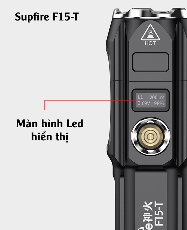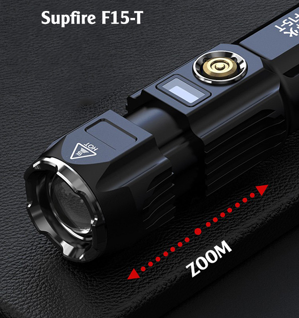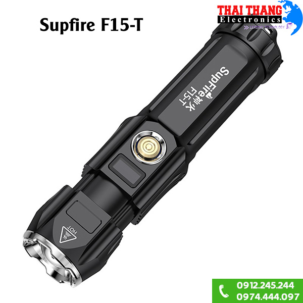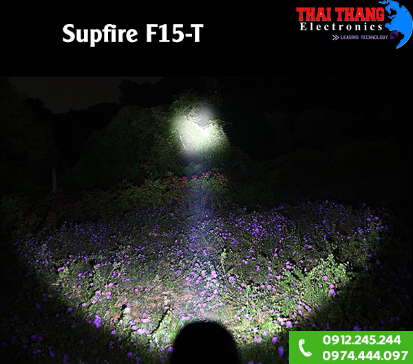 Đèn pin siêu sáng Supfire F15-T sử dụng bóng led P90 công suất 36W làm nguồn sáng cho cường độ chiếu sáng lên đến 2000 lumens. Đèn có khả năng điều chỉnh chùm tia tụ, tỏa giúp phù hợp với nhiều mục đích chiếu sáng khác nhau. Đèn có khả năng chiếu xa lên đến 200m trong đêm khi chỉnh ở chế độ tụ chùm tia. Đặc biệt đèn có chế độ chiếu sáng rất đa dạng gồm 6 chế độ sáng, trong đó 3 chế độ sáng thông thường lần lươt là 1100lm, 600lm, 200lm và 3 chế độ sáng nâng cao ở mức 2000lm, chế độ SOS và Flash. Trên thân đèn có màn hình hiển thị chế độ sáng và mức năng lượng của đèn.