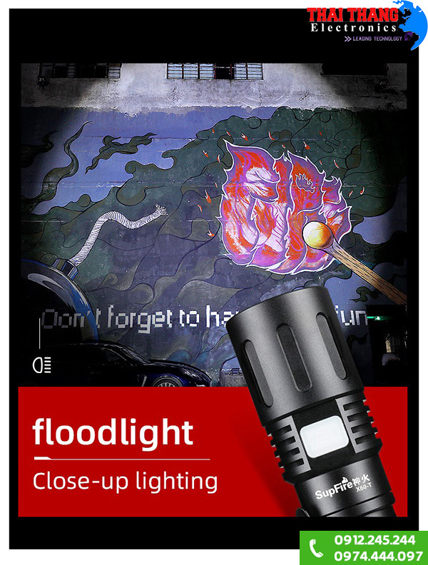 Đèn pin cầm tay Supfire X60-T sử dụng nguồn sáng là bóng led Cree XHP90 cho độ sáng lên đến 3000 lumens với công suất chiếu sáng lên đến 36W. Chóa đèn có thiết kế đặc biệt cùng hệ thống zoom điều chỉnh chùm tia to hoặc nhỏ cho phép đèn chiếu xa với khoảng cách 300m trong đêm tối. Nhằm mang đến cho người dùng nhiều tùy chọn chiếu sáng hơn nên X60-T được trang bị năm chế độ chiếu sáng gồm mạnh, vừa, yếu, nhấp nháy và SOS. Tất cả chế độ được chuyển đổi thông qua một công tắc trên thân đèn. Đặc biệt đèn còn đóng vai trò như sạc dự phòng cho phép sạc ngược lại những thiết bị di động giúp người dùng sử dụng trong những tình huống khẩn cấp.