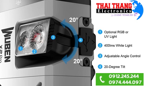 Đèn pin UV cực tím Wuben X2 Pro được thiết kế thêm cụm led trên thân đèn gồm 1 led sáng trắng dịu nhẹ với cường độ sáng đạt 400 lumen và led cảnh báo RGB gồm led UV bước sóng 365nm, led sáng đỏ, đỏ nhấp nháy, nhấp nháy xanh dương đỏ, nhấp nháy vàng đỏ, nhấp nháy xanh lá đỏ. Cụm led này có thể điều chỉnh xoay 20° giúp người dùng dễ dàng điều chỉnh góc chiếu.